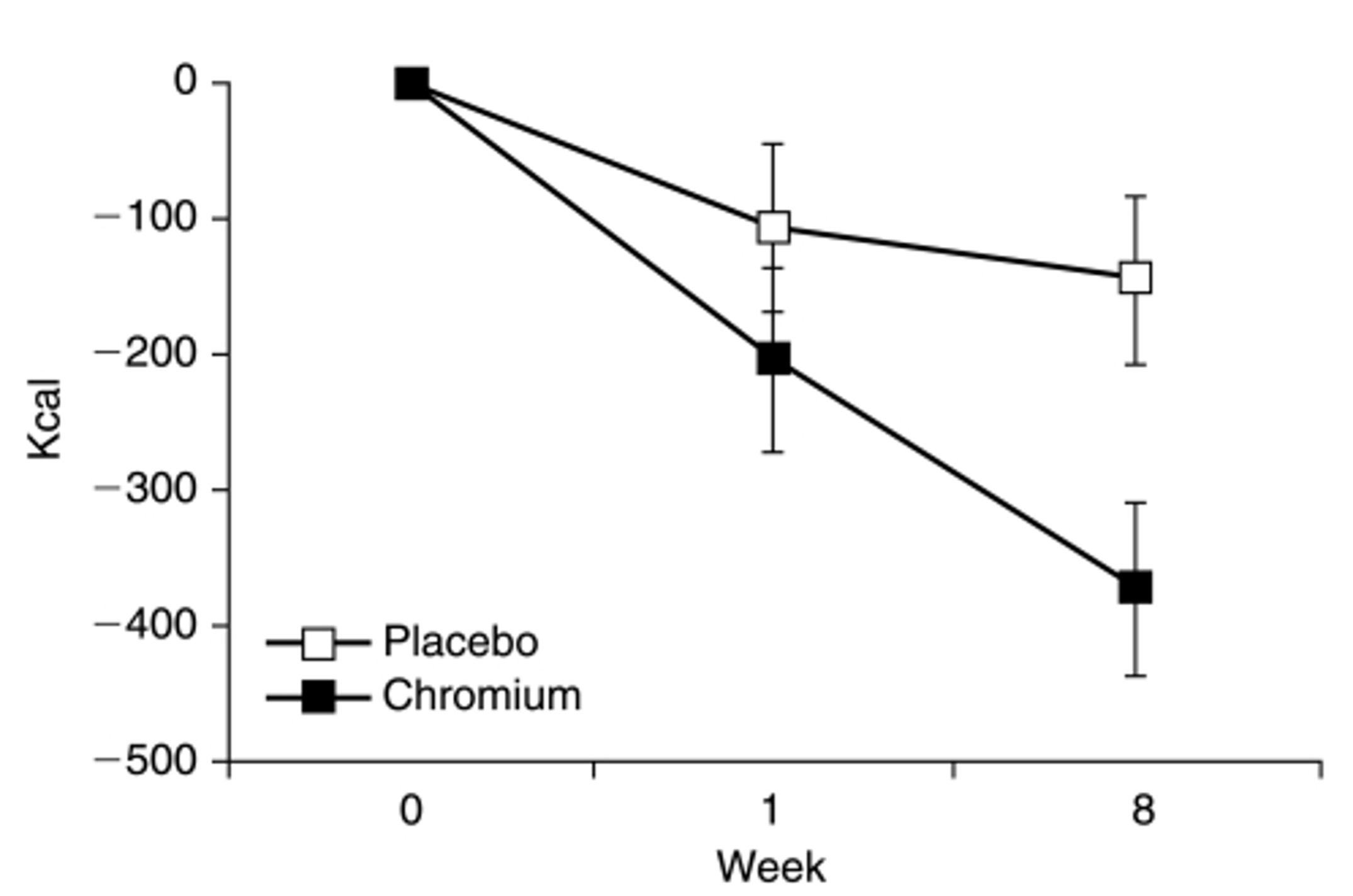 Som vist i denne figuren fra studiet som er publisert(1), ser vi at placebo-gruppa reduserte kaloriinntaket sitt med litt over 100 kalorier – trolig bare fordi de var bevisste på at matinntaket ble registrert. Men når vi sammenligner med de som inntok krom, så gikk faktisk kaloriinntaket ned til nesten minus 400 kalorier, forteller Pierce.