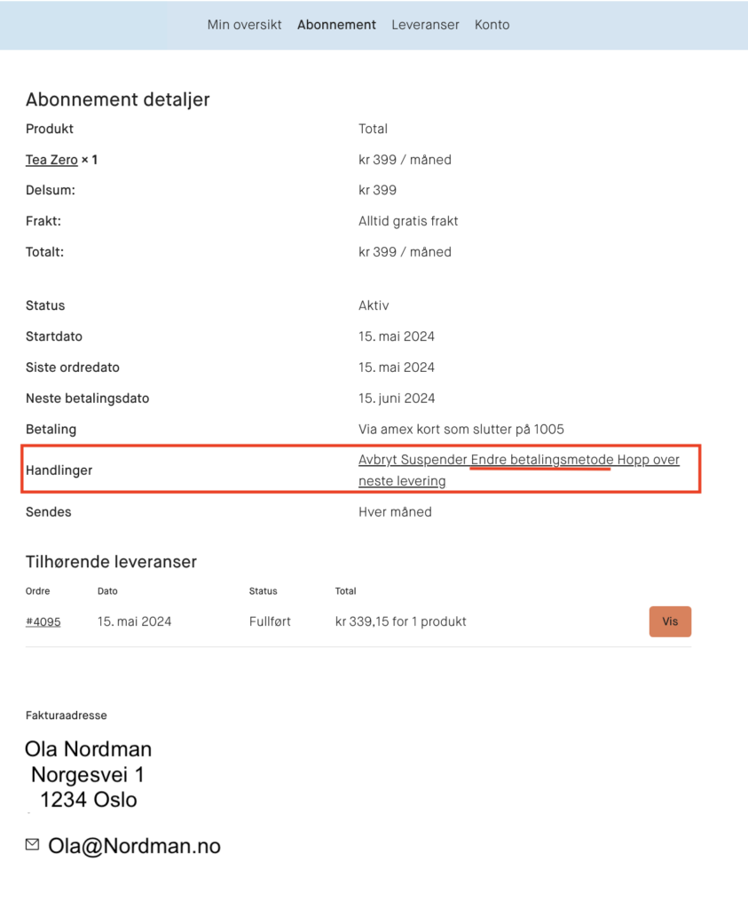 Trykk deg så inn på «Abonnement», du vil da få opp denne siden hvor du kan endre betalingsmetode: