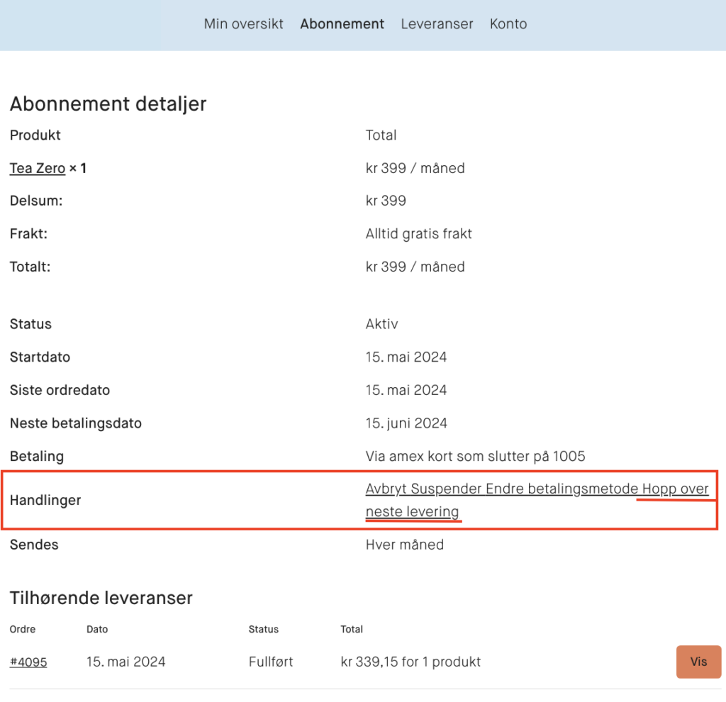 Det er fullt mulig! Når du er logget inn på Min Side trykk på fanen «Aboonement». Under Handlinger kan du trykke på «Hopp over neste levering», som markert i rødt i eksempel-bildet nedenfor.
