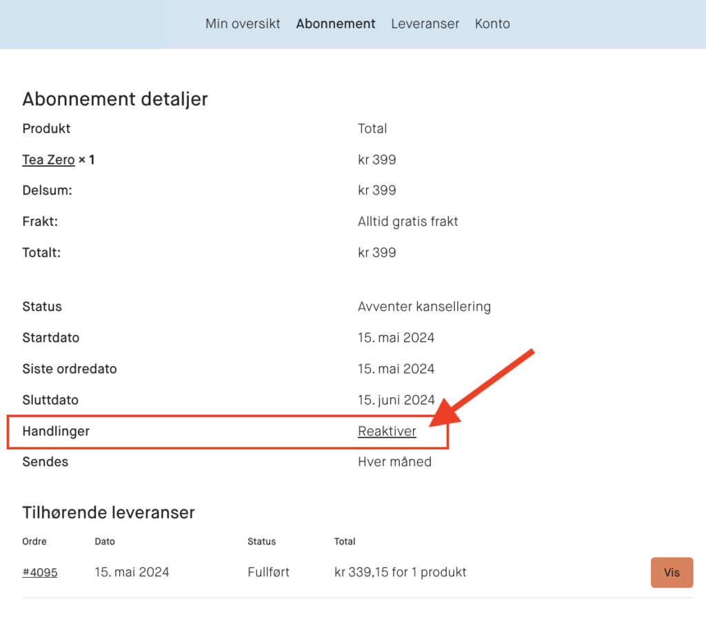 Reaktivering av ditt abonnement gjør du enkelt via Min Side. Gå til fanen «Abonnement» og velg det abonnementet du ønsker å reaktivere. Trykk «Se abonnement». Deretter velger du «Reaktiver», som vist i eksempel-bildet under.