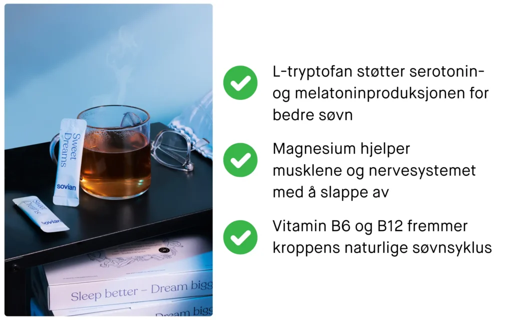 For å sikre at du får den søvnen du trenger, kan det være nyttig å skape gode søvnrutiner og unngå faktorer som kan forstyrre søvnen, som stress og uregelmessige leggetider. Hold soverommet mørkt og kjølig, og unngå skjermbruk rett før leggetid for å fremme produksjonen av melatonin.Oppdag hvordan søvn påvirker helsen din, hvorfor den svekkes med alderen, og hvordan L-tryptofan i Sovian støtter naturlig melatoninproduksjon for bedre søvn.